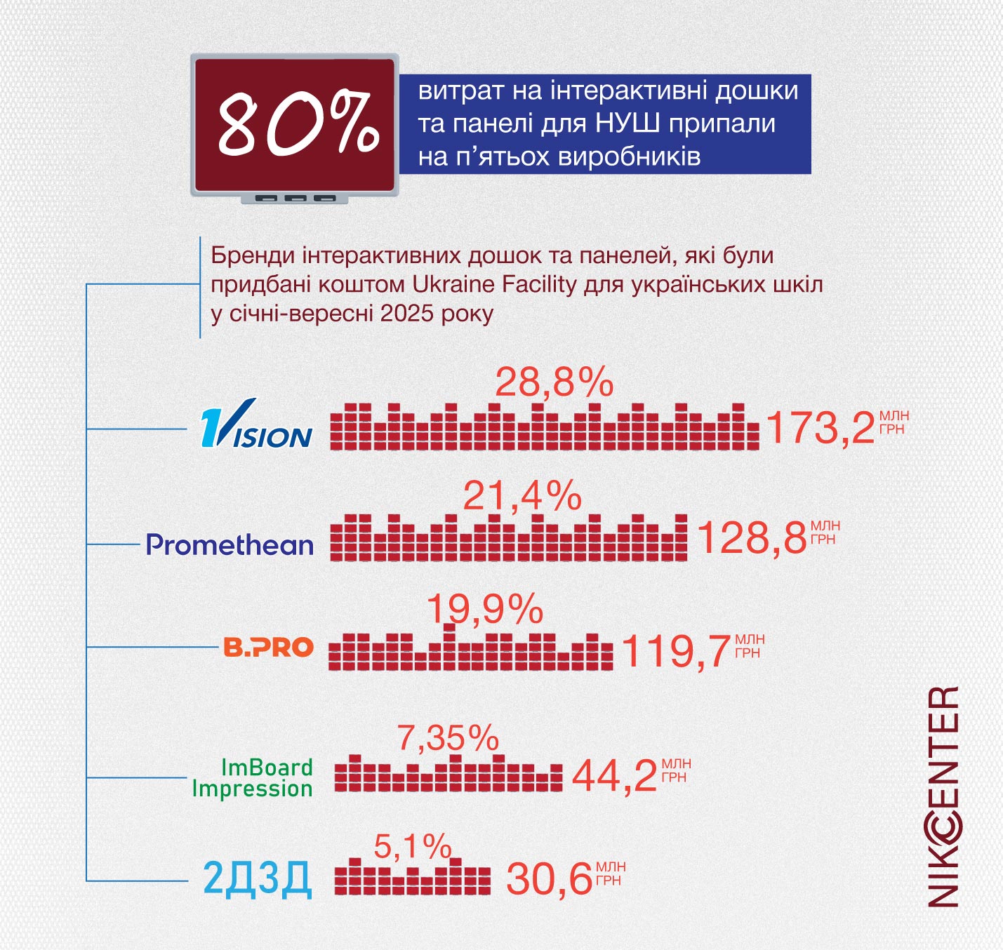 ООО «Дидактиклаб» предоставило справку, что производителем панелей является киевская компания «Навигатор систем». Всего в январе-сентябре 2025 года за средства Ukraine Facility было приобретено панелей этого бренда на 44,2 млн грн. На его долю пришлось 7,35% от общей стоимости закупок интерактивных панелей и досок.
