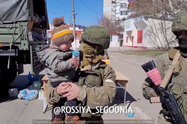 Рашисты превращают раздачу в Херсоне своей «гуманитарки» в пропагандистские спектакли, используя даже детей 2022-03-28