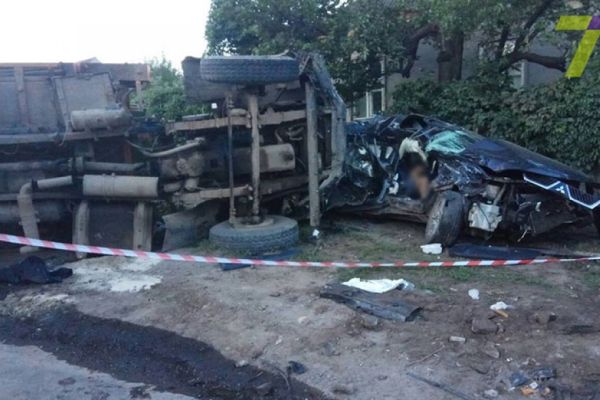 В Одессе мусоровоз, выехав на «красный», перевернулся и раздавил внедорожник