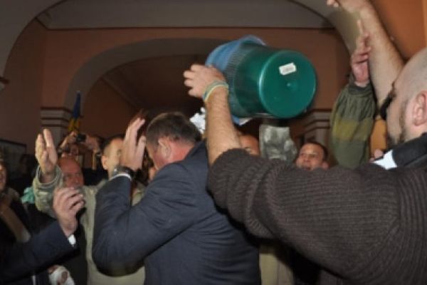 Днепропетровские активисты выломали двери областной прокуратуры и надели на голову прокурора урну с бумагами 2014-09-30