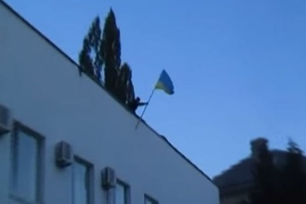 В Ждановке Донецкой области со здания горисполкома сорвали флаг Украины, разложили его на асфальте и начали топтать 2014-09-21