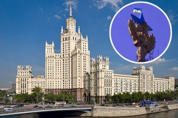 В центре Москвы на легендарной высотке перекрасили звезду в национальные цвета Украины и вывесили украинский флаг 2014-08-20
