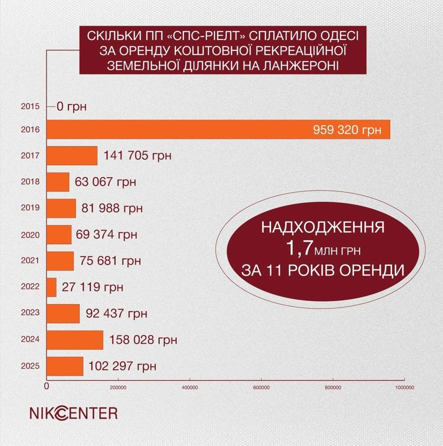 Приватна компанія «СПС-Ріелт» за десять років оренди рекреаційної земельної ділянки на пляжі Ланжерон в Одесі сплатила до міського бюджету лише 1,7 мільйона гривень. При цьому вартість цієї земельної ділянки оцінюють в 16,5 мільйона гривень.